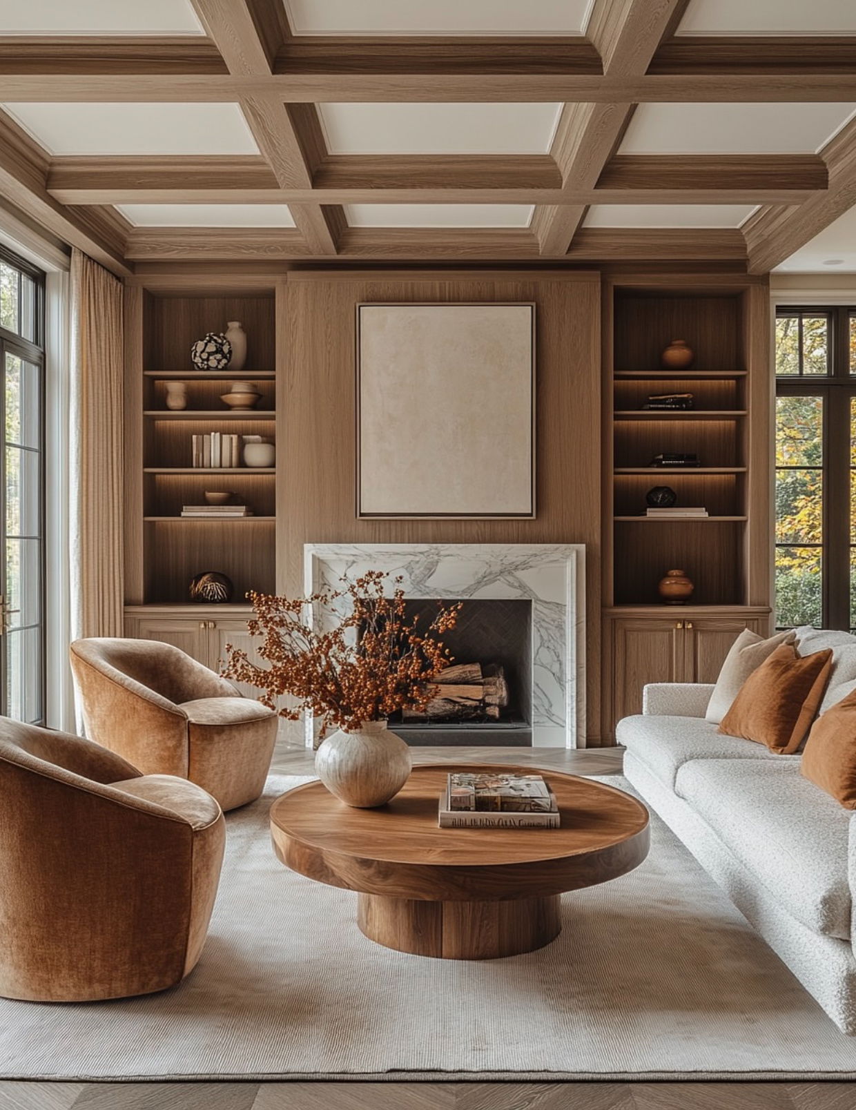 Step into a home where elegance meets comfort. The entryway greets you with a grand chandelier casting a warm, inviting glow. The living room, adorned with plush velvet sofas and intricately patterned rugs, exudes sophistication. Tall windows draped with luxurious curtains allow natural light to flood the space, highlighting the tasteful artwork on the walls.