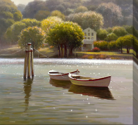 Experience the tranquility of the water with this captivating canvas wall art. Featuring a pair of boats gliding on shimmering water and lush greenery in the background, this gallery-wrapped canvas brings a coastal and nature-inspired charm to any space.